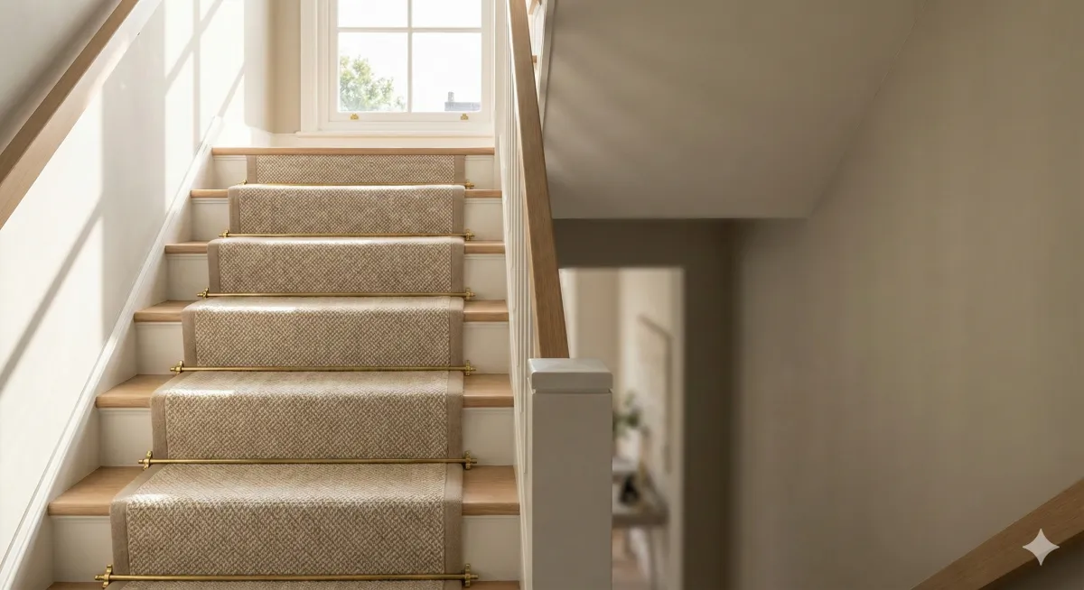 Precision-cut stair runner installation designed for durability, safety, and a clean finished look. Custom fit with attention to every edge and transition.